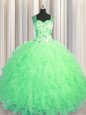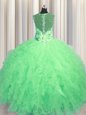 See Through Zipper Up Tulle Sleeveless Floor Length Quinceanera Gown and Beading and Ruffles