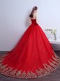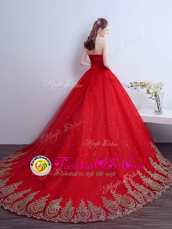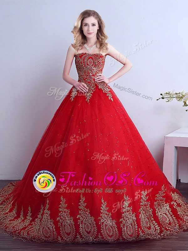 Sequins Court Train Ball Gowns Quinceanera Dresses Red Strapless Tulle Sleeveless Lace Up