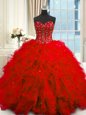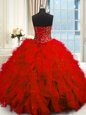 Sequins Red Sleeveless Organza Lace Up Quinceanera Dresses for Military Ball and Sweet 16 and Quinceanera