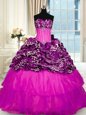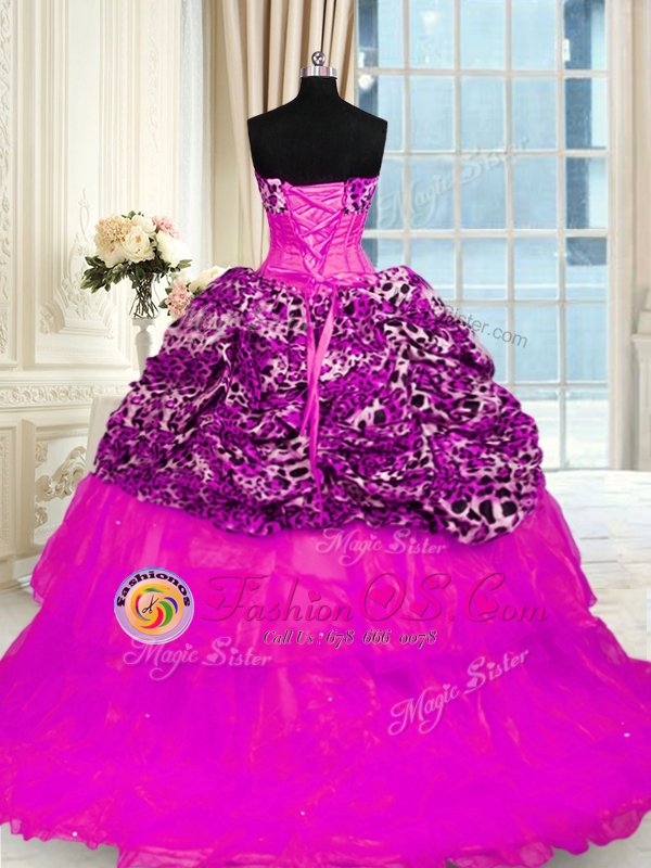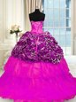 Sequins Ruffled Strapless Sleeveless Sweep Train Lace Up Quinceanera Gowns Fuchsia Organza and Printed