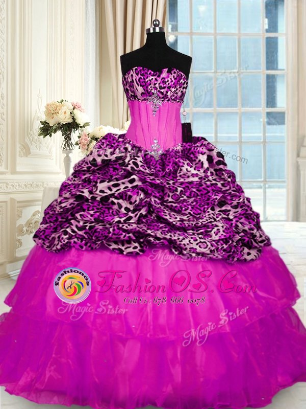 Home >  Quinceanera Dresses >  Fast Delivery Quinceanera Dresses > Sequins Ruffled Strapless Sleeveless Sweep Train Lace Up Quinceanera Gowns Fuchsia Organza and Printed