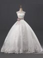 Sequins Tulle and Lace Sleeveless Floor Length Wedding Dresses and Lace and Appliques and Ruching and Belt