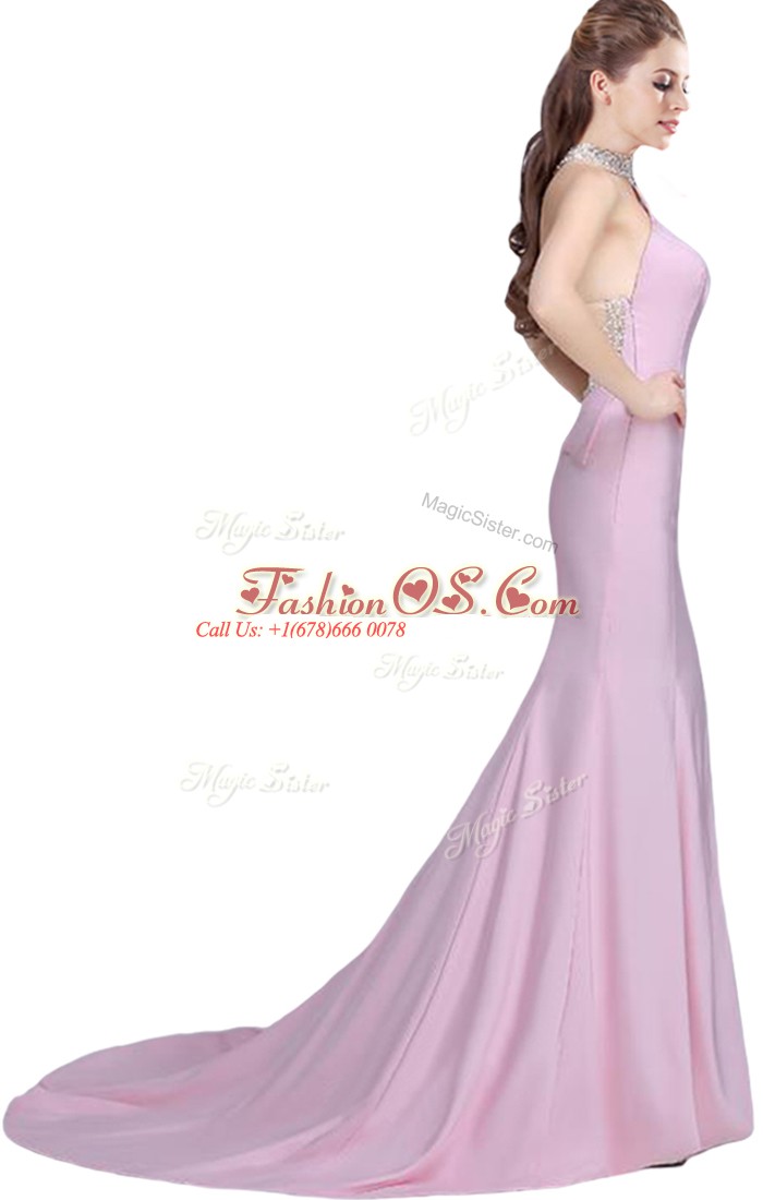 Home >  Prom Dresses >  Perfect Prom Dresses > Sexy Baby Pink Prom and Party with Beading Halter Top Sleeveless Brush Train Side Zipper