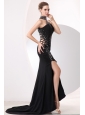 Do you want to surprise the crowd at your next event? This amazing sexy black evening gown has a glamorous celebrity style with dramatic touches including dazzling beadwork on the halter-top neck, a seductive and unique side lace up design, and an elegant attached train that cascades to the floor. What's more, mermaid skirt together with the a sexy side slit endow attraction to this surprising prom gown.