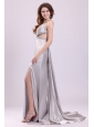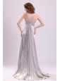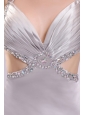 Home >  Prom Dresses >  Fashionable Prom Dresses > Sexy Column V neck Grey Watteau Train Beading Elastic Woven Satin Prom Dress with Criss Cross