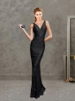 Home >  Prom Dresses >  Modest Prom Dresses > Sexy Deep V Neckline Black Modest Prom Dress with Brush Train