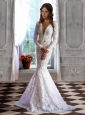 Sexy Mermaid Deep V Neck Brush Train Lace Wedding Dress with Long Sleeves
