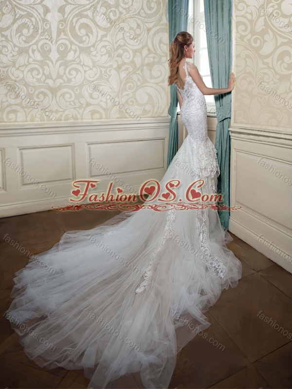 Sexy Mermaid Straps Tulle Lace Wedding Dress with Chapel Train