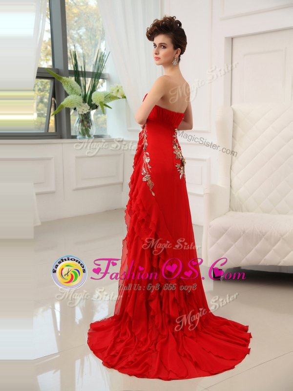 Sexy Red Column/Sheath Beading and Appliques and Ruffled Layers Celeb Inspired Gowns Zipper Chiffon Sleeveless With Train