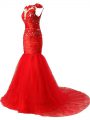 Sexy Red Mermaid Tulle Scoop Cap Sleeves Lace and Appliques and Ruching Zipper Prom Party Dress Brush Train