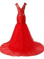 Home >  Prom Dresses >  Prom Dresses On Sale > Sexy Red Mermaid Tulle Scoop Cap Sleeves Lace and Appliques and Ruching Zipper Prom Party Dress Brush Train