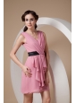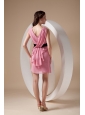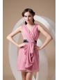Sexy Rose Pink Mother of the Bride Dress Column / Sheath V-neck Chiffon Ruch Mini-length