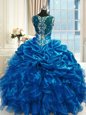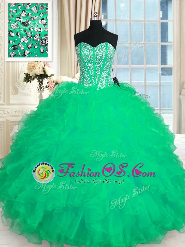 Sexy Turquoise Ball Gowns Sweetheart Sleeveless Organza Floor Length Lace Up Beading and Ruffles Quinceanera Dresses