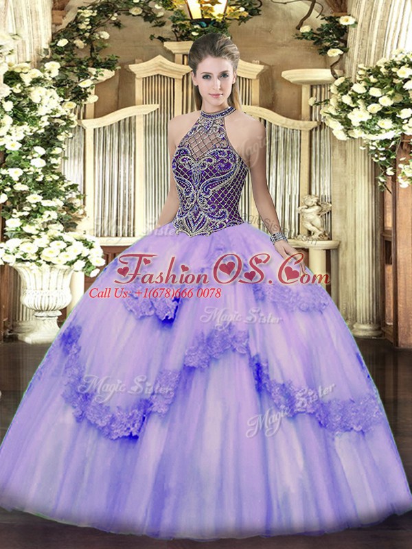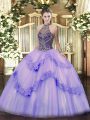 Shining Lavender Sleeveless Floor Length Beading and Appliques Lace Up Ball Gown Prom Dress