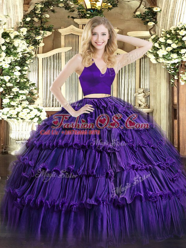 Shining Purple Zipper Halter Top Ruffled Layers Quinceanera Dresses Organza Sleeveless