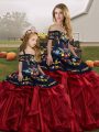 Shining Red And Black Sweet 16 Quinceanera Dress Military Ball and Sweet 16 and Quinceanera with Embroidery and Ruffles Off The Shoulder Sleeveless Lace Up