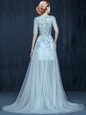 Shining Scoop Half Sleeves Tulle With Brush Train Zipper Celebrity Prom Dress in Lavender for with Appliques