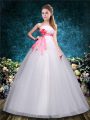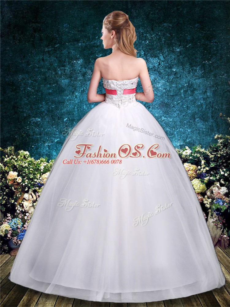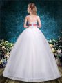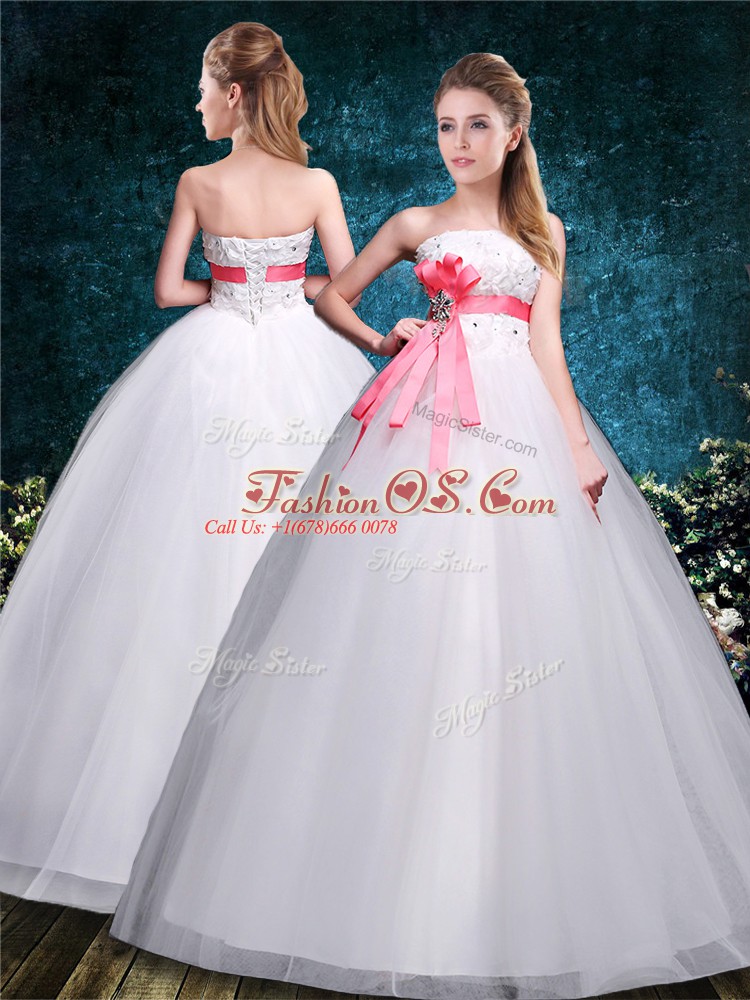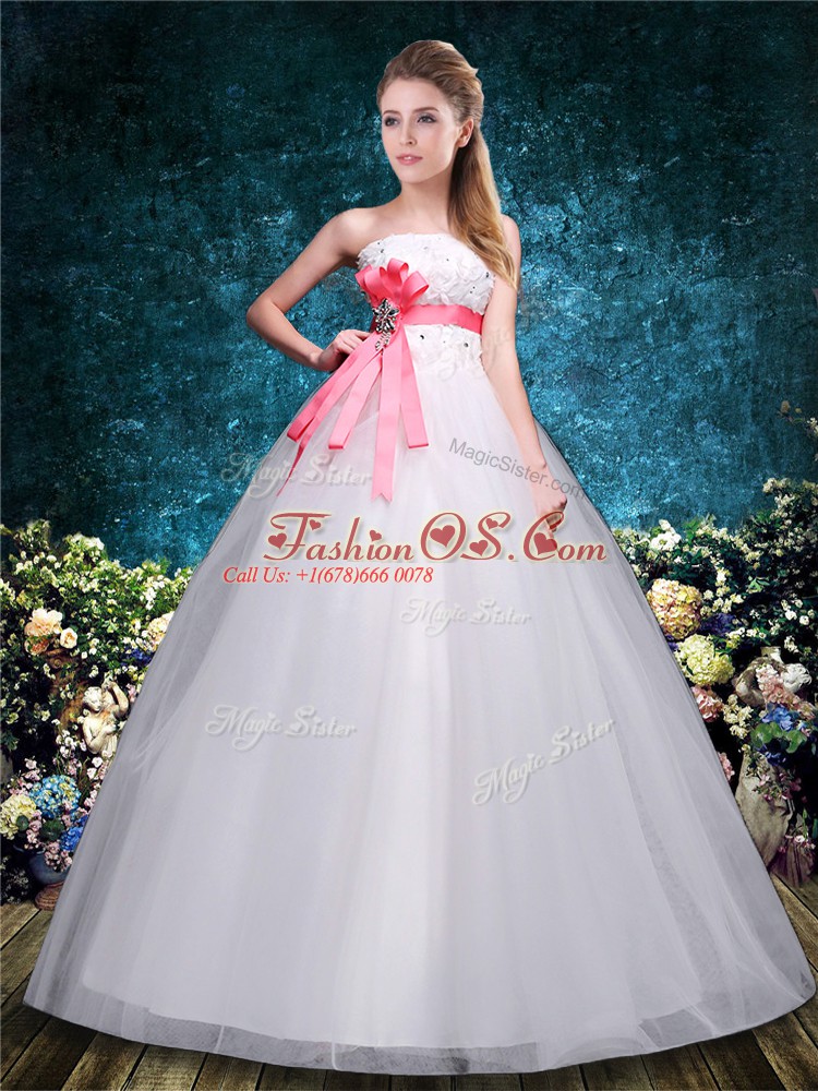Shining White Tulle Lace Up Strapless Sleeveless Floor Length Wedding Gowns Appliques and Belt