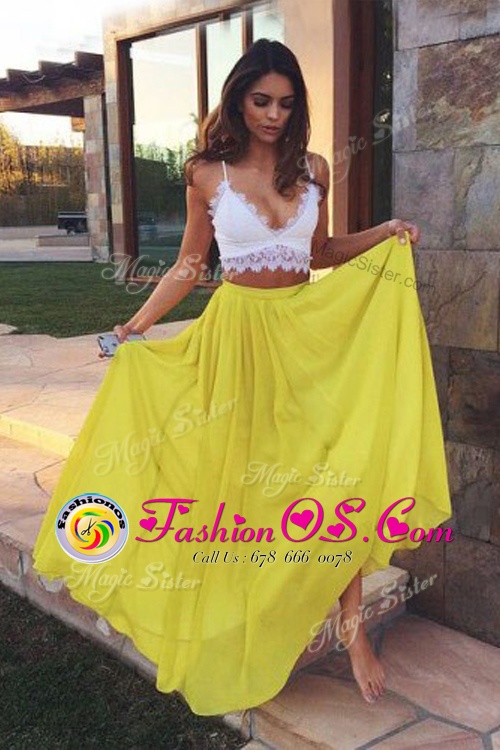Home >  Special Occasion Dresses >  Homecoming Dresses > Shining Yellow Chiffon Zipper Spaghetti Straps Sleeveless Floor Length Homecoming Gowns Ruching