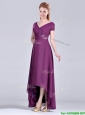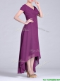 Short High-low Chiffon Dark Purple Short Sleeves Mother of the Bride Dress with V Neck
