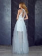 Short Inside Long Outside High Neck Light Blue Sexy Prom Dress with Appliques and Beading