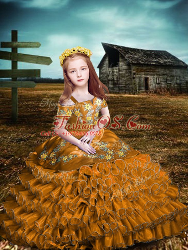 Home >  Special Occasion Dresses >  Pretty Little Girl Pageant Dresses > Short Sleeves Floor Length Embroidery and Ruffled Layers Lace Up Pageant Gowns For Girls with Brown