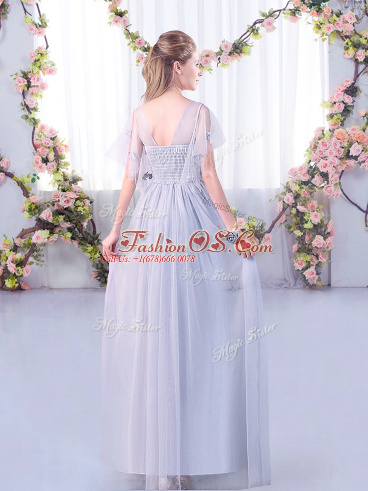 Home >  Special Occasion Dresses >  Cheap Dama Dresses > Short Sleeves Tulle Floor Length Side Zipper Dama Dress for Quinceanera in Light Blue with Lace and Belt