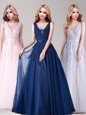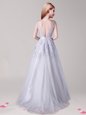 Silver A-line Appliques and Belt Prom Party Dress Backless Tulle Sleeveless Floor Length