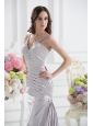 Silver Column V-neck Satin Prom Dress with Ruching and Beading