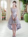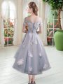 Silver Off The Shoulder Neckline Appliques Dress for Prom Cap Sleeves Lace Up
