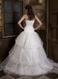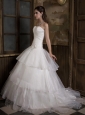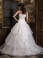 Get the attention you deserve in this pure wedding dress perfect for your big day. This white strapless wedding dress has very refined pleated bodice and a lovely hand made flower on the left waist. The floor length skirt is made of layers of tulles, which has an amazing shape and creates a beautiful silhouette while the small train makes the dress even more beautiful. Such a perfect dress, why not bring it to your party!