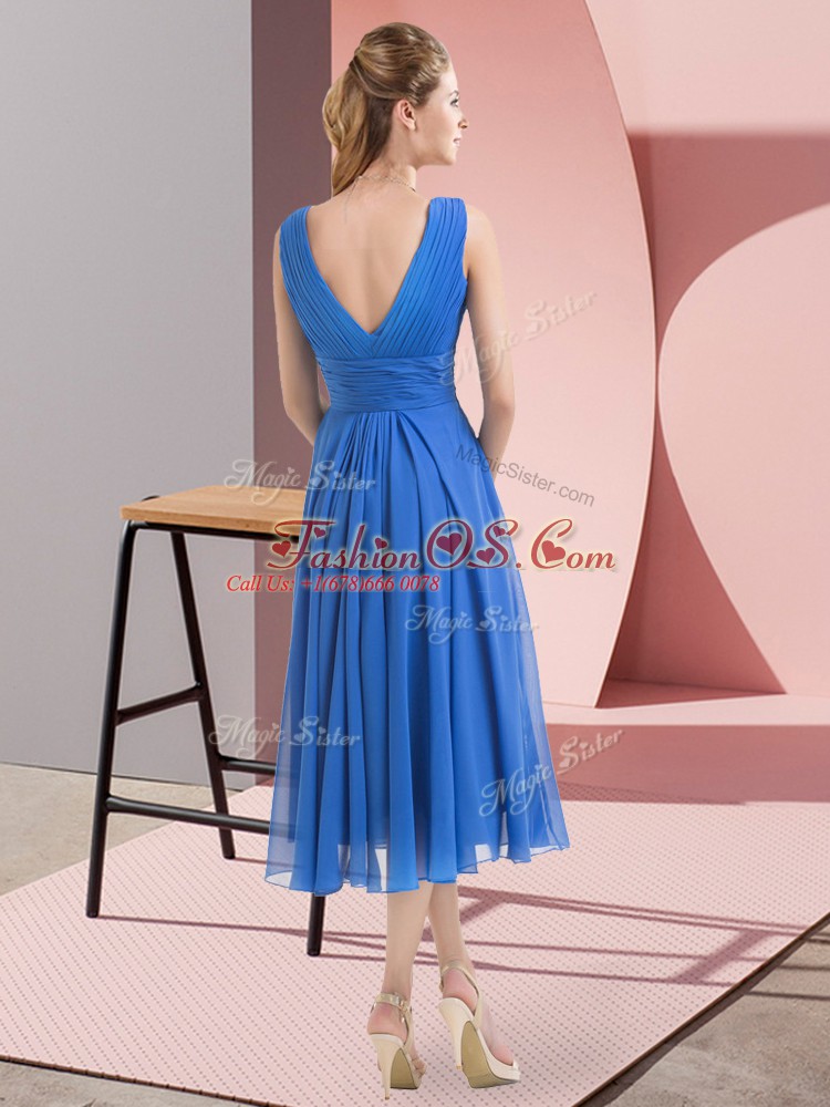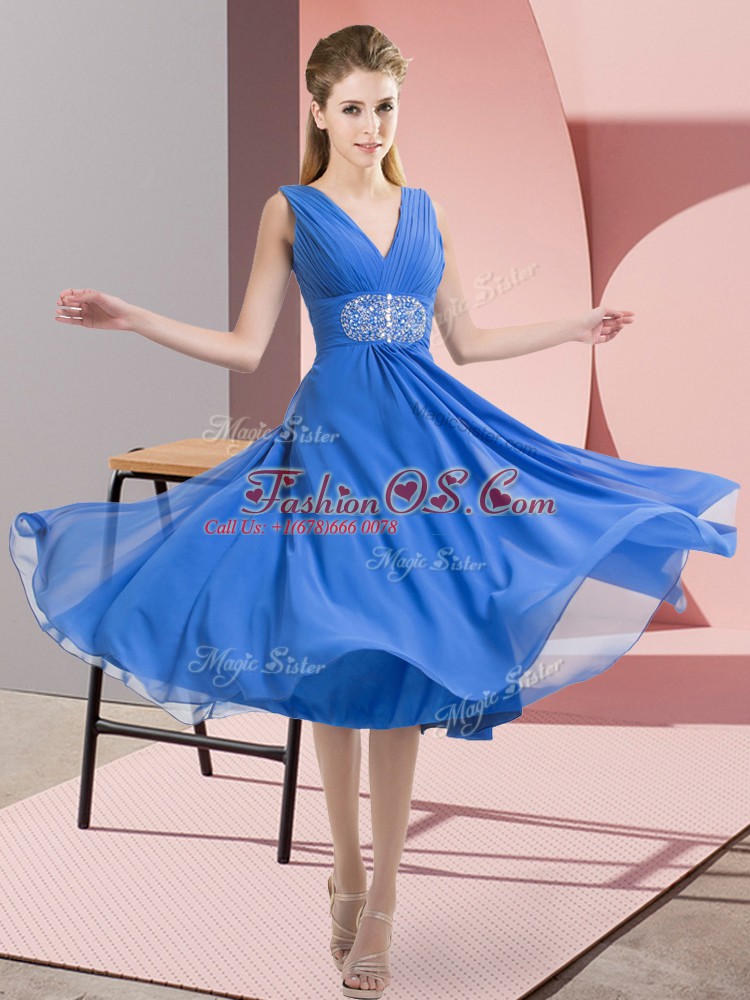 Simple Baby Blue Empire Chiffon V-neck Sleeveless Beading Knee Length Side Zipper Bridesmaid Dresses