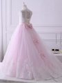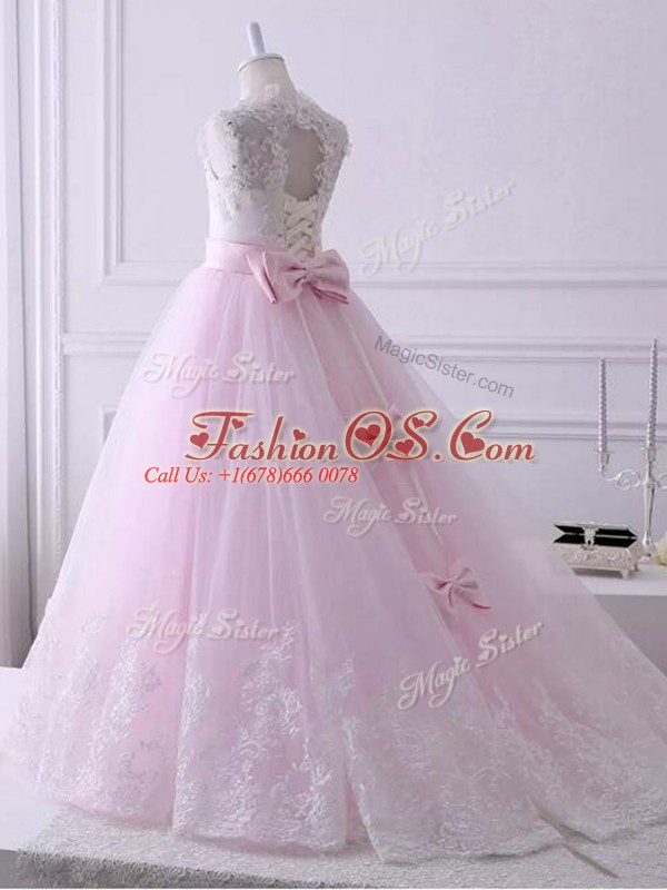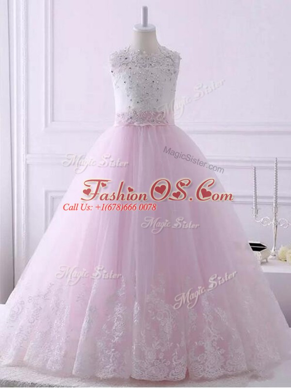 Simple Baby Pink Lace Up Scalloped Lace Girls Pageant Dresses Tulle Sleeveless Brush Train
