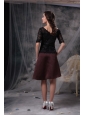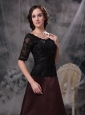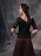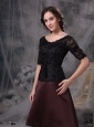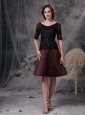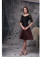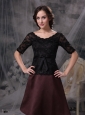 Are you looking for a elegant suitable dress for your daughter's big day? This dress must just be the one you want! Black and brown dress, scoop neckine with zipper up back design make the dress more decent and elegant. Unique print of the lace fabric covered fitted bodice and decorates a simple bowknot waistband. The half sleeves can keep warm and embellish your arms. The knee-length mother of the bride dreses can show your slim perfectly.