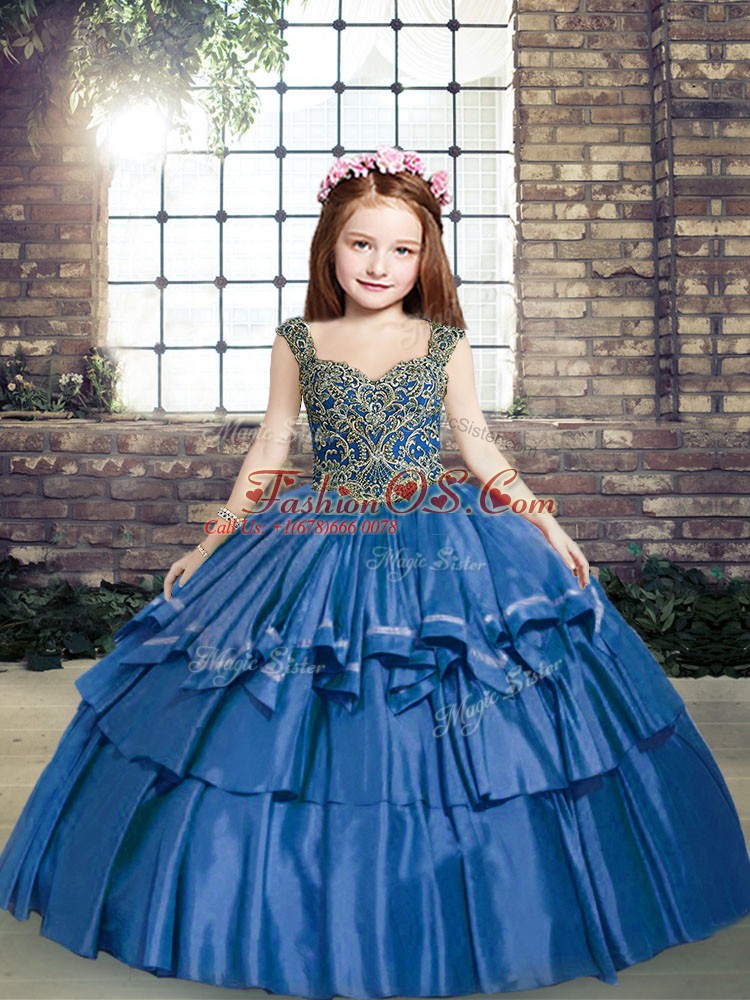 Home >  Special Occasion Dresses >  Beautiful Kids Pageant Dresses > Simple Blue Ball Gowns Beading Pageant Dress for Girls Lace Up Taffeta Sleeveless Floor Length