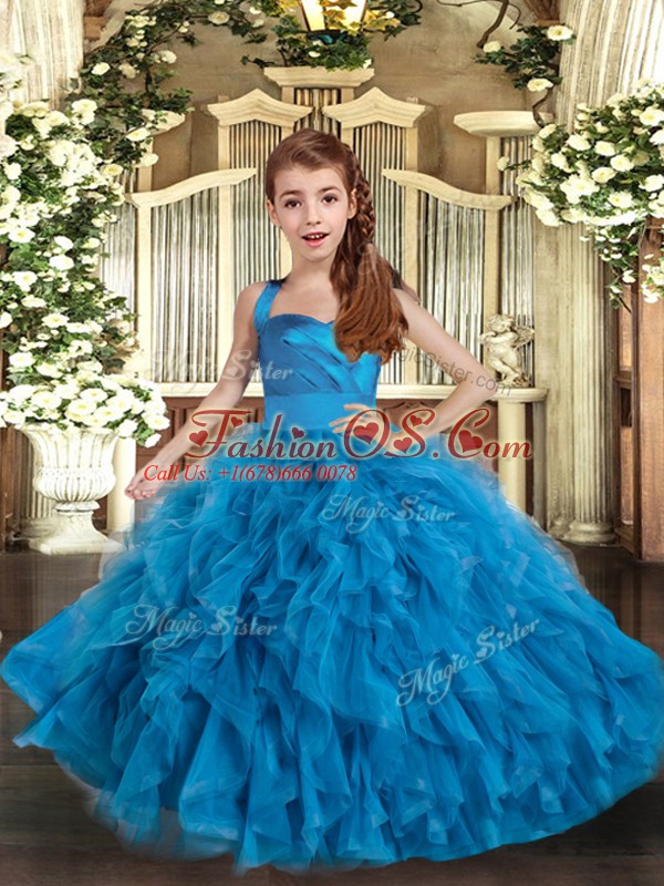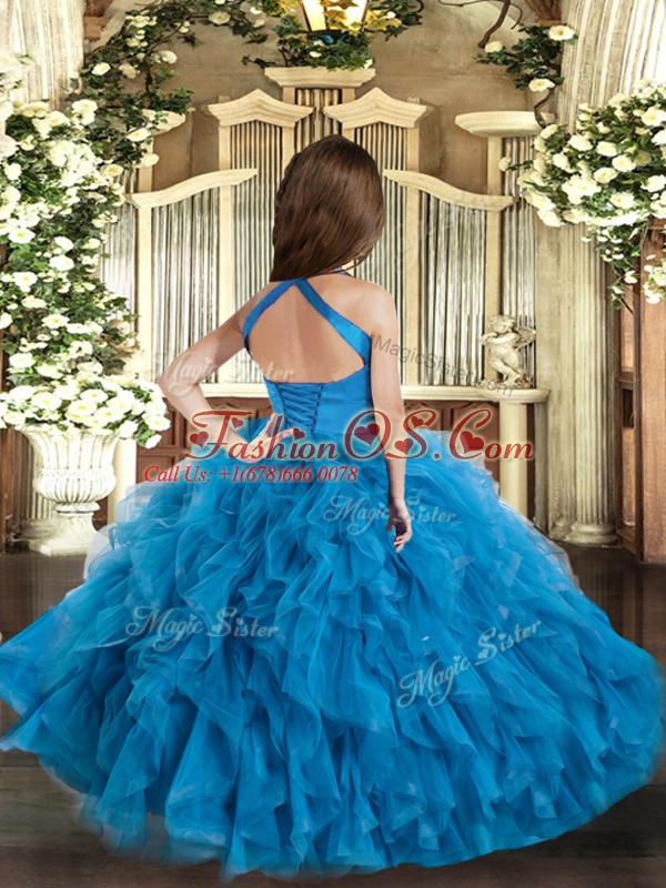 Simple Blue Tulle Lace Up Kids Pageant Dress Sleeveless Floor Length Ruffles