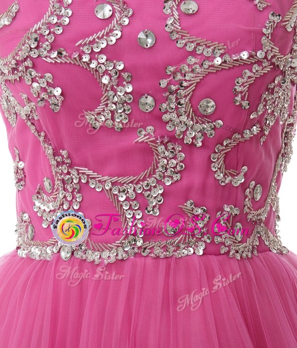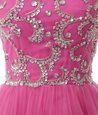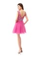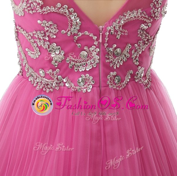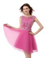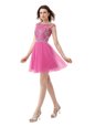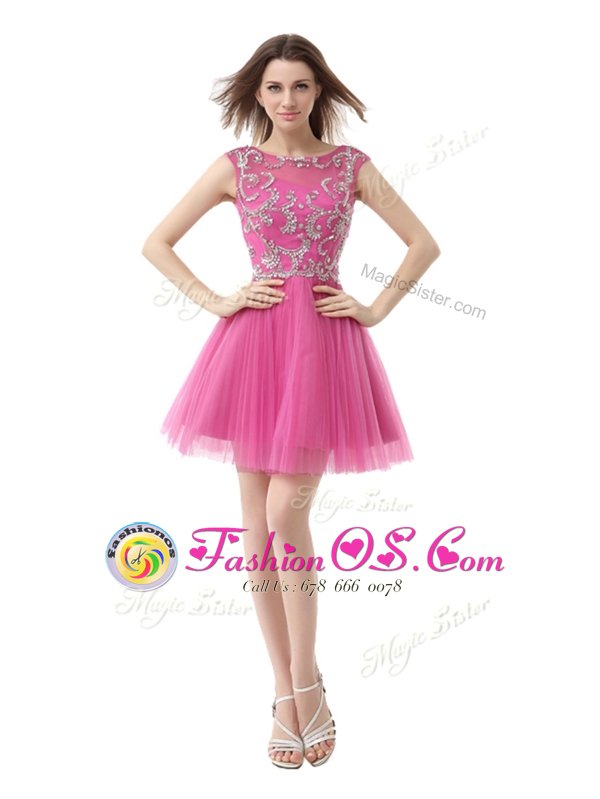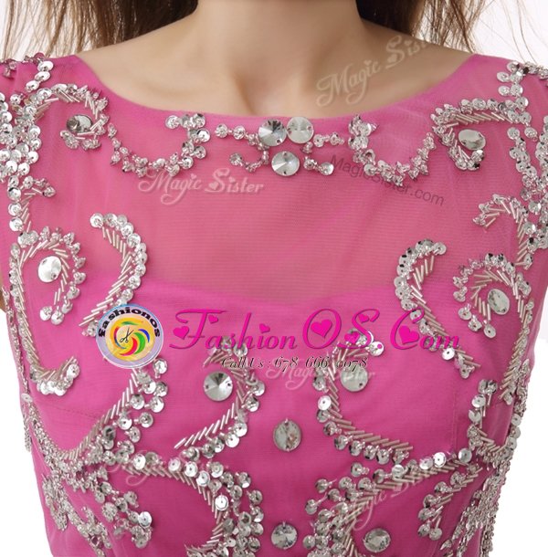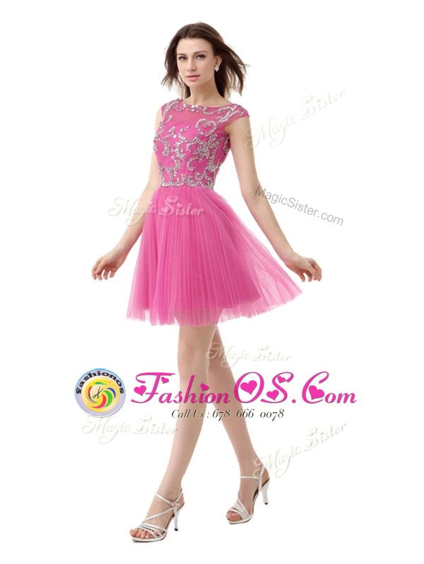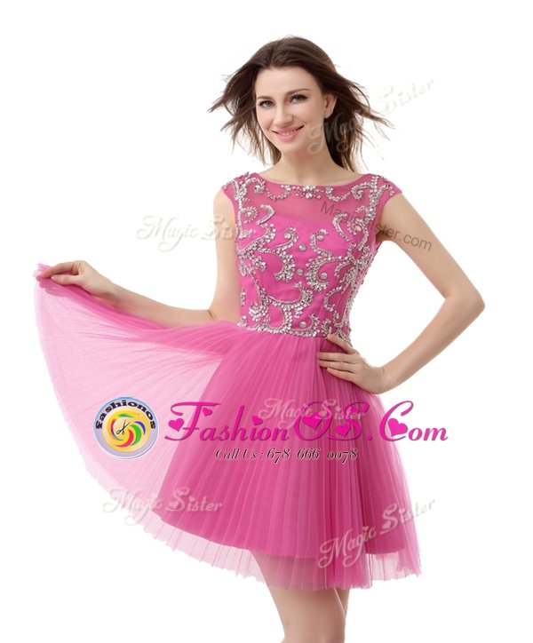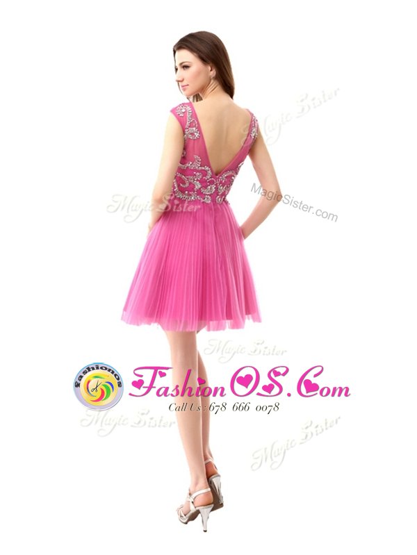Simple Chiffon Scoop Cap Sleeves Zipper Beading and Sequins and Pleated Cocktail Dresses in Rose Pink
