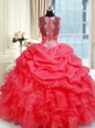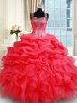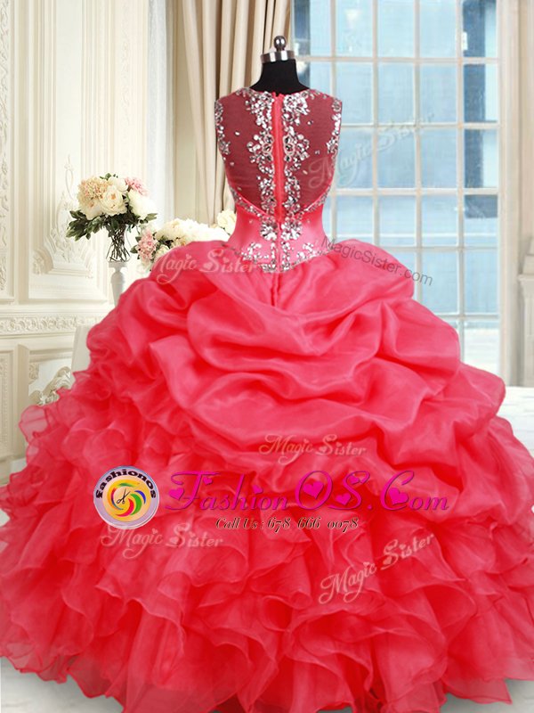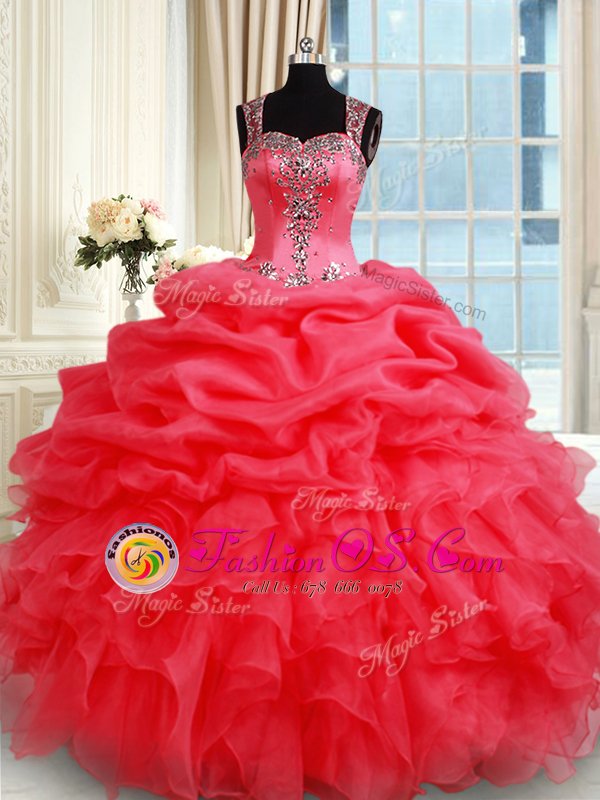 Simple Coral Red Quinceanera Dresses Military Ball and Sweet 16 and Quinceanera and For with Beading and Ruffles and Pick Ups Straps Sleeveless Zipper