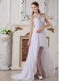 This exotic dress will win attention for sure! It's all in soft and pure chiffon encrusted a special halter top with heavily beaded straps gathered in its way and form a keyhole on the center of bust. The pleats on bodice run smoothly to the hemline of high-ended skirt in front. The high-low skirt with a lovely brush train in the back is of fashion and charm. The back is crossed with beaded straps and a hidden zipper finishes the elegant look. You will be belle in this dress!