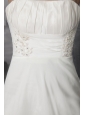 How elegant the wedding gown is! This dress features a strapless ruched bodice which can show the delicat of the dress. The wasiband-like decoration on the waist adorned by the floral embelishment and beads can contures your curves very well. The simple yet gorgeous skirt makes you feel like a million. The lace up back finishes the gorgeous design.