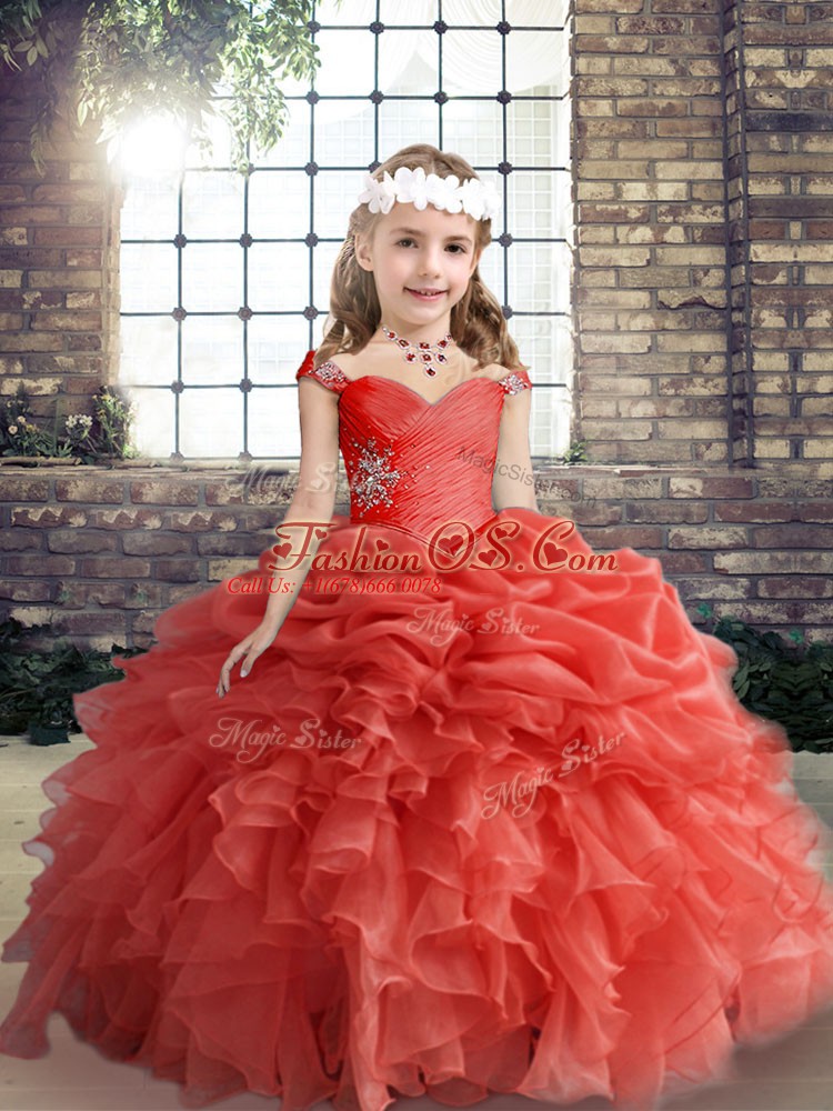 Simple Floor Length Coral Red Girls Pageant Dresses Straps Sleeveless Lace Up