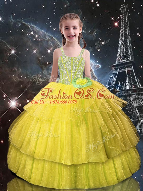 Simple Light Yellow Straps Lace Up Beading and Ruffled Layers Pageant Dress for Teens Sleeveless