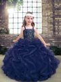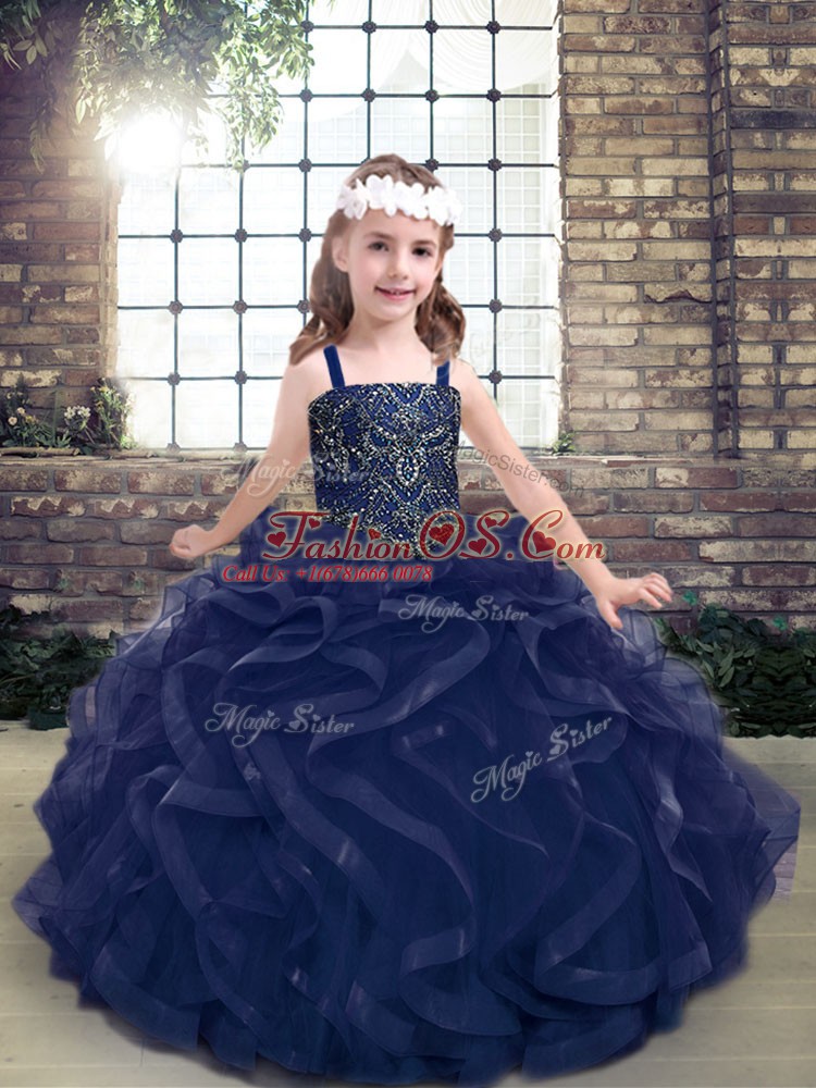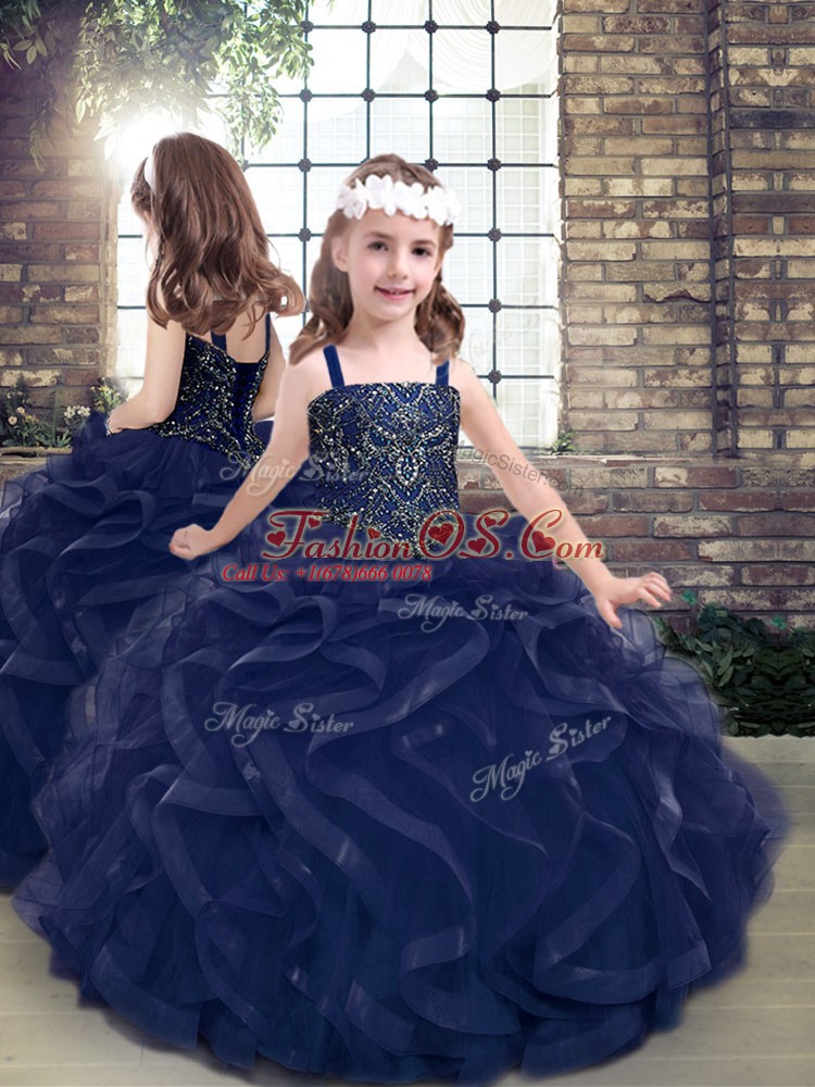 Simple Straps Sleeveless Tulle Kids Pageant Dress Beading and Ruffles Lace Up