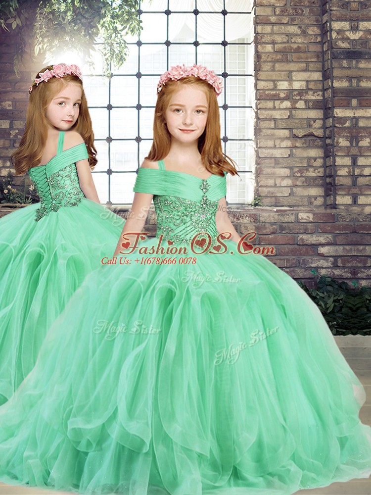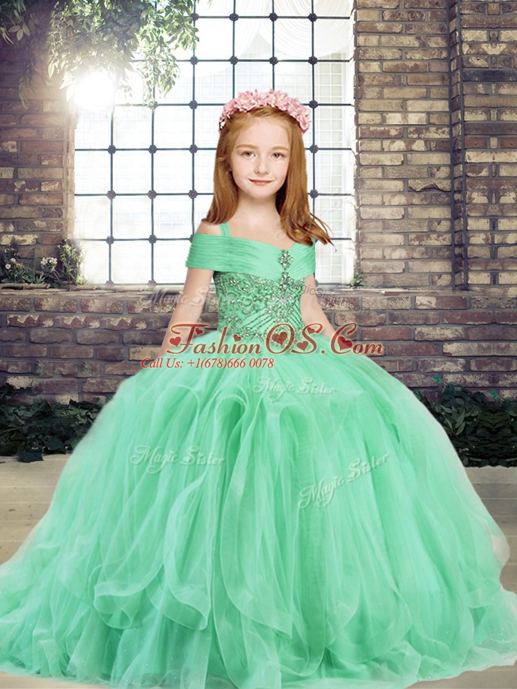 Simple Tulle Sleeveless Floor Length Pageant Gowns For Girls and Beading and Ruffles