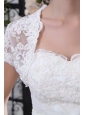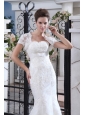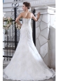 This fabulous wedding gown is really breathtaking. It is made of soft lace material. The corset bodice features a slight sweetheart neckline. A contrasting sash is employed to create a empire waistline which accents your figure. The classic mermaid style makes the dress elegant and vintage.Fastener decorated on the back adds charm and detail to the dress, a chapel train closes the look.