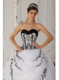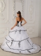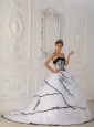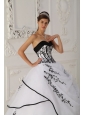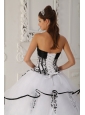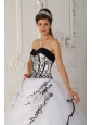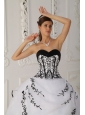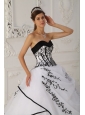 Classic white quinceanera gown. Intricate black embroidery encrusts on the specially designed bodice. The ball gown features layers of asymmetrical ruffle which hemed with black details. The enchanting floral appliques scattered throughout the whole skirt to complete the look.