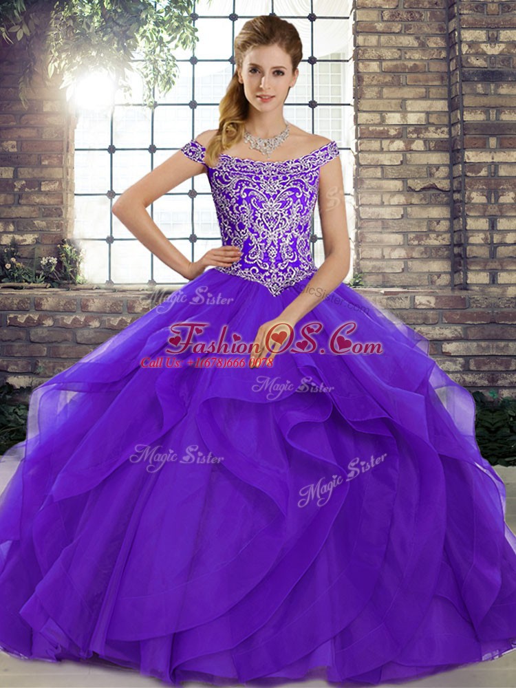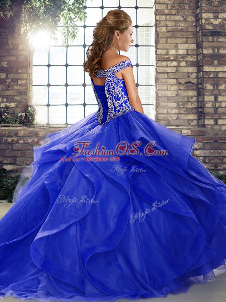 Sleeveless Brush Train Beading and Ruffles Lace Up 15th Birthday Dress