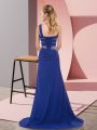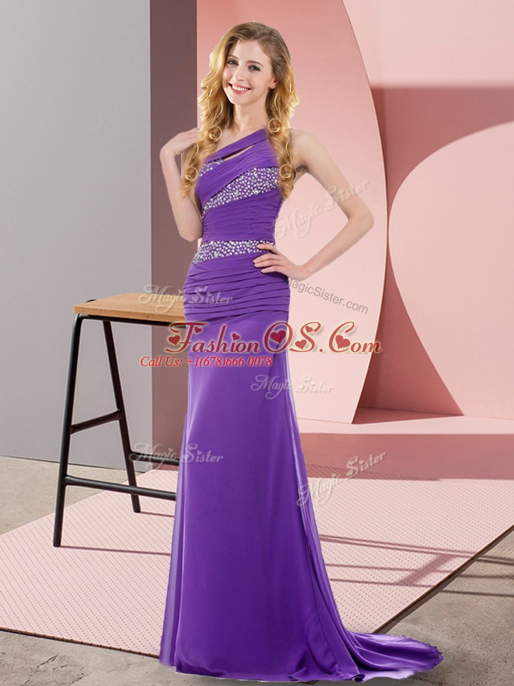 Sleeveless Chiffon Floor Length Sweep Train Lace Up Prom Dresses in Purple with Beading
