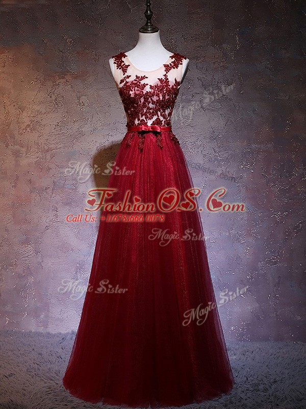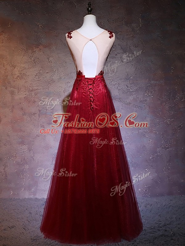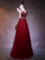 Sleeveless Elastic Woven Satin Floor Length Backless Prom Party Dress in Wine Red with Appliques