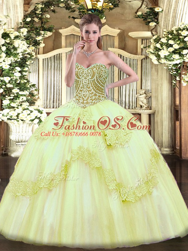 Sleeveless Floor Length Beading and Appliques Lace Up Quince Ball Gowns with Yellow Green